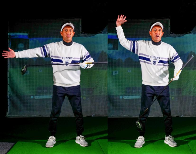 「いまの動きは体をねじってない状態での話。体をねじったら腕は後ろにいくんですけど、体を動かさずに正しい右腕の動き、その延長にあるクラブの話をした場合、腕もクラブも背中側にはいきません」(内海プロ)