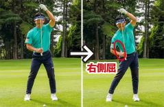 ちょっと難しい話になりますが、インパクト時の「右側屈」もゆるやかダウンブローに打つためのポイントです。プロたちはインパクトで上体を真っすぐか、少し右傾きの体勢を作ります。