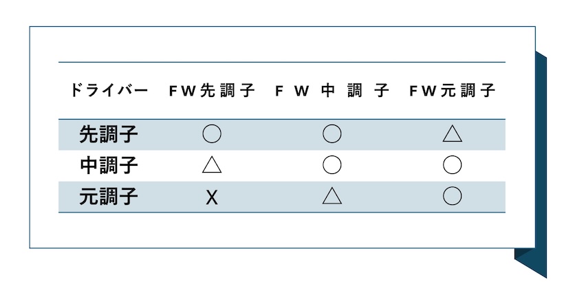 ドライバーが先調子の場合、FWは先か中ならOKですが、元は避けた方がいい。ドライバーが中調子なら先はいまひとつで、中と元はOK。ドライバーが元調子なら先はダメ、中はまあまあで元はOKです。わかりやすいよう表にしました。