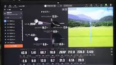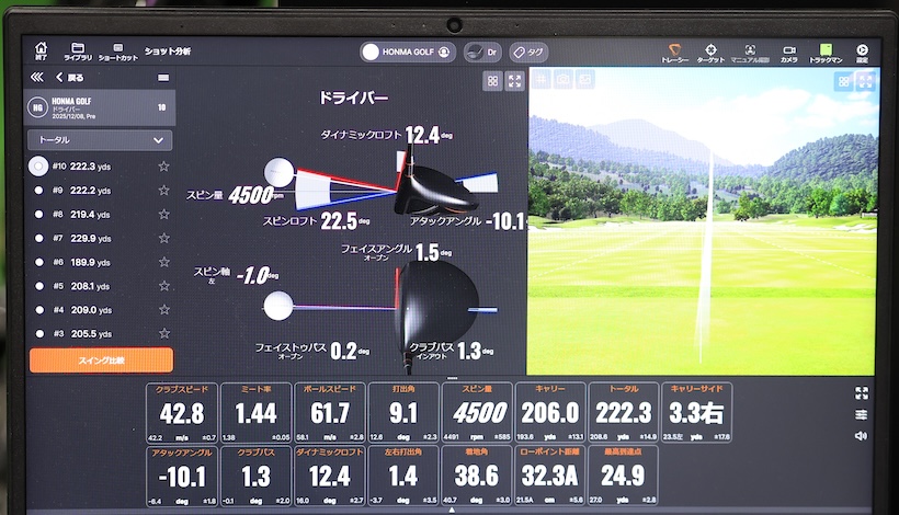 同店のHONMAブースはレーダー式弾道計測機トラックマン4を完備。手始めにマイドライバーの弾道を計測してみると、ヘッドスピード42m/s台、ボール初速は60m/sを超えているがキャリー200ヤードと、飛距離に結びついていない。スピンが4500回転とアイアン並みに多いことが原因だ。同店マネージャーも務める谷合信俊フィッターは、スピンが増えるそもそもの要因はスイングにあると指摘した。