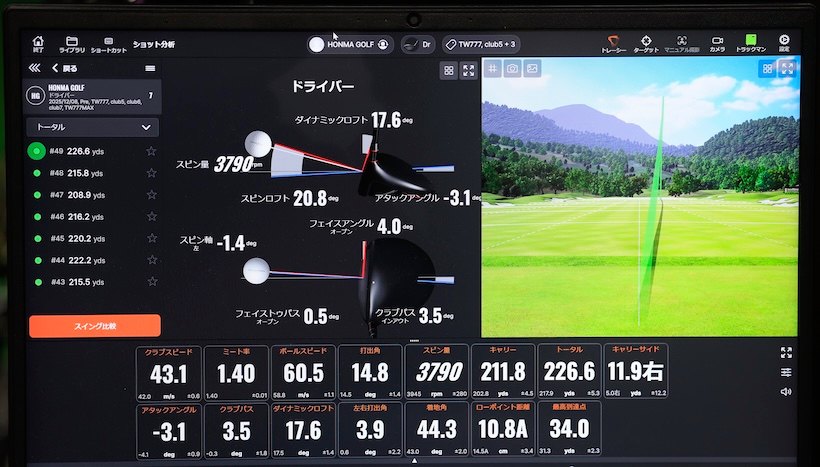 最初に試したのはマイドライバーとスペックが近しい「TW777 MAX」(ロフト角10.5度設定)と「VIZARD BLUE」(50S)。振り心地をチェックするのが目的だ。