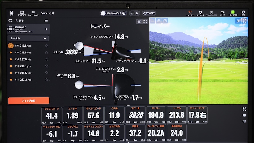 フィーリングの違いはトラックマンの示す数値にもはっきり表れた。ヘッドスピードは1m/sもアップ。スピンは1000回転マイナスで2000回転台まで落ち、キャリーとトータル飛距離がそれぞれ14 ヤードずつ伸びた。