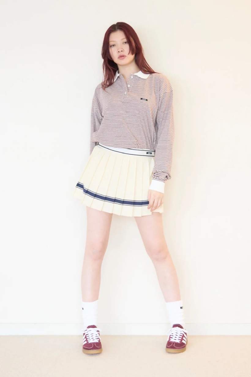 肌ざわりの良いコットン素材のラガーシャツは、ほどよくゆったりとしたシルエットで大人カジュアルに。プリーツミニスカートは、ウエストゴムで、内側にはライナーショーツとポケットを備えて安心感もプラスしている。