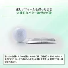 狙いたい位置にミラーを置き、そのすぐ横(目標側)にボールをセットするだけで、コースで求められる正しい構えを再現した状態でパター練習が可能。矢印や基準線に合わせて目と肩の位置を調整し、パターを軽くのせて黒い矢印をストロークガイドにすることで、正しい目線・肩・頭の位置が自然と身につきます。ラインに対してブレのないアドレスが習慣化され、より実戦につながる練習ができる。