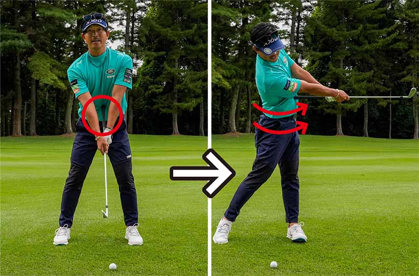 でもカラダの回転量はフルスイングと変わりません。ポイントは腕と手の動きを抑制し、インパクトゾーンの軌道を安定させることにあります。