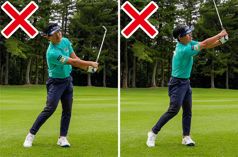 腕や手の動きでクラブを低い位置に止めようとしたり、腕がカラダから離れたりしてはいけません。ライン出しがうまくできない人は手をリリースするために、カラダと手の距離が変わってしまうのです。