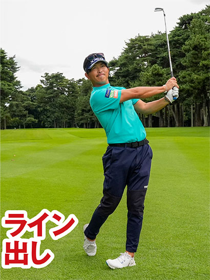 プロたちはカラダの回転と腕の振りのバランスが整っているので、当然ライン出しよりもフルスイングのほうが飛びます。アマチュアの方もライン出しの練習を多く積んでスイングの完成度を高めていけば、結果的にフルスイングの精度も向上してライン出しよりも飛ぶようになりますよ。