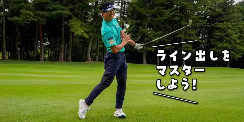 グリップエンドがお腹につくまでクラブを短く持って素振りしましょう。インパクトからフォロースルーにかけては腕や手を使わず、胸がターゲット方向を指すまでカラダを素早く左にターン。最初に構えた体勢のまま、カラダと手の距離をキープしてクラブを低く振り抜くのがライン出しの基本です。