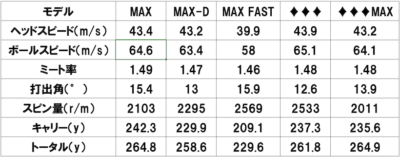 試打シャフトは「MAX」「MAX D」「♦♦♦」「♦♦♦MAX」がオリジナルシャフトの「ATHLEMAX(アスレマックス)」(S)、「MAX FAST」は「SPDSTAR(エスピーディースター)」(S)を装着して試打。