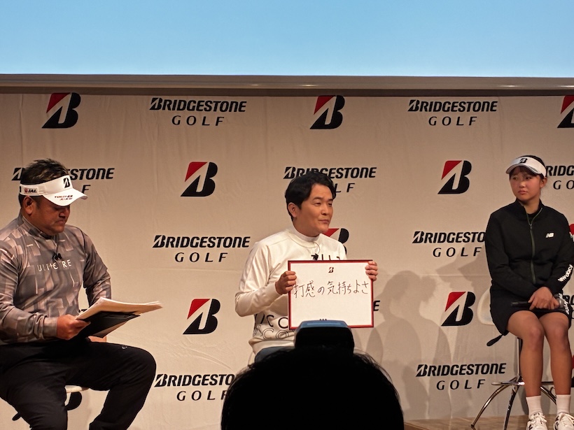 木下稜介、堀川未来夢、清水大成、桑木志帆、鶴岡果恋、伊藤愛華もNEW「TOUR B X/XS」の魅力について、多くを語った。その印象をひと言で表現すると? との質問にプロたちは、「強」(木下稜介)、「信頼度」(堀川未来夢)、「耐」(清水大成)、「風に強い」(桑木志帆)、「スピン性能」(鶴岡果恋)、「方向性」(伊藤愛華)と、用意していたフリップで回答。