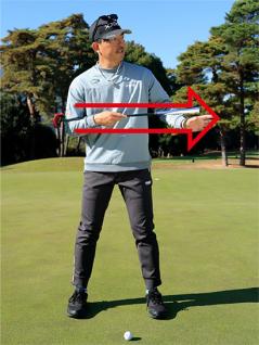 アドレスで一番大事なのは両ヒジの高さです。両ヒジの向きと言いかえてもいいでしょう。両ヒジにパターを乗せるとすれば、パターが水平となるようなアドレスが究極の理想です。