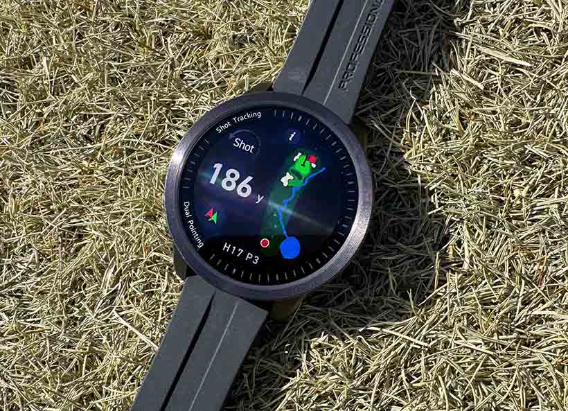 今回僕がコースで使ったのは「ボイスキャディT12PRO」です。腕時計型の距離計測器なのですが、めちゃ軽いんですよね。前作よりも厚さも約1.5ミリほど薄くなっているらしいし、重さもベルト込みで46.6gしかないんです。なので「着けてる感」が本当に少ない。それでいて画面はかなり大きくて見やすいんですよね。