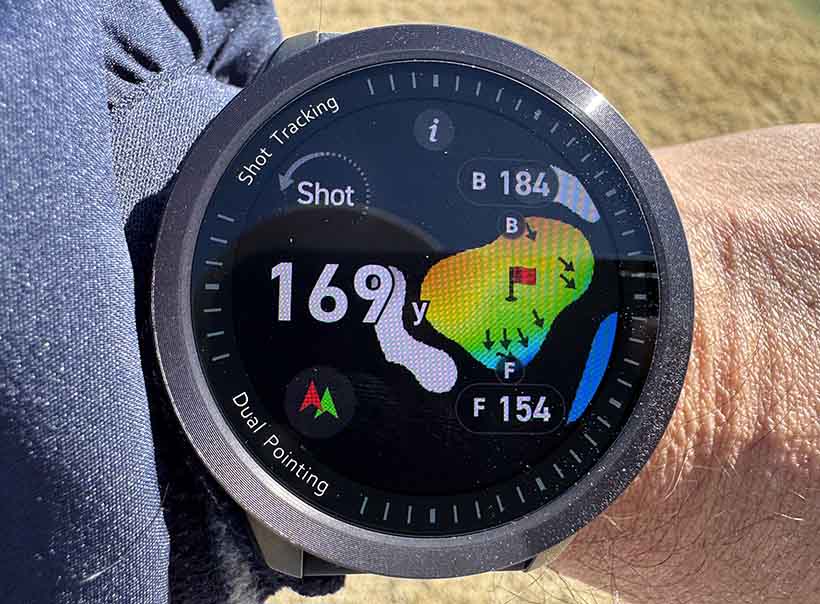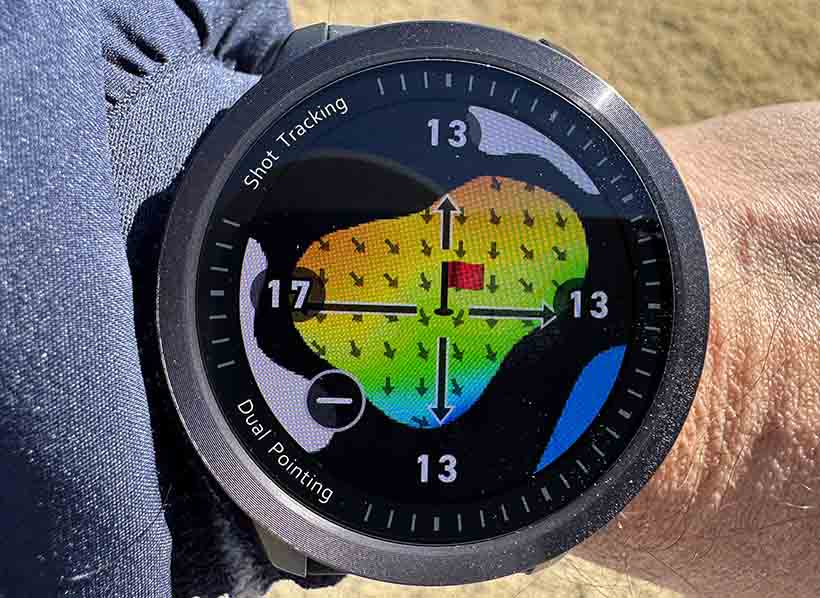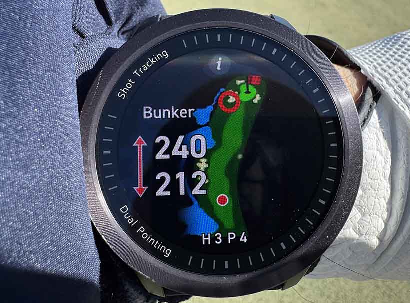 さてコースでのレポートですが、まずはコースに着いたらラウンドするコースを認識させないといけないわけですが、これがめちゃくちゃ速い。スマホの専用アプリと連携しておけば、「Quick GPS+」という機能でアッという間にコースを見つけ出してくれます。これまたストレス無し。