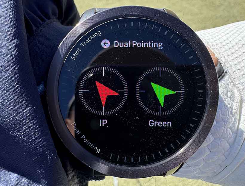また、ドッグレッグホールなどで役立つコンパス機能も便利なんです。ティショットの前にこの画面にすると、グリーン方向とIPポイントの方向を示してくれるんですよ。なので、狙い所を絞りやすい。ティショット以外の時はグリーン方向だけを示す画面になるので、ショットを曲げた時や打ち上げでグリーン方向がわからない時に役立ってくれます。