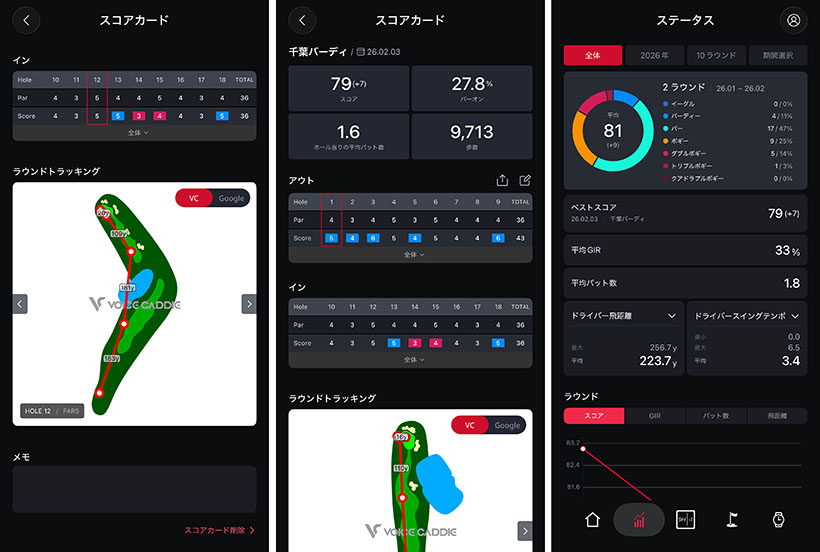 ラウンドしていて思ったのは、勝手にどんどん画面が必要なものに変わっていってくれること。グリーンに近づけばグリーン周りやグリーンの情報画面に勝手になるし、スコア入力画面にもなる。次のホールのティに行けば勝手にそのホールのレイアウト画面になるしね。自分で画面を切り替える必要がほとんどないんですよね。これは本当にノーストレスで楽ちんです。