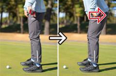 ドライバーやアイアンなどのショットと同じように、前傾姿勢を作るには腰のツケ根から上体を折り曲げて骨盤も軽く前傾させることを習慣づけましょう。体重は土踏まずから母指球にかけての部分に感じられるのがベストです。