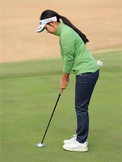 青木瀬令奈プロのアドレスを見てもわかるように、パットがよく入る人は両ヒザの角度や前傾姿勢など全体のバランスが整っています。やや腰高に構えていて、懐(ふところ)のスペースに余裕が感じられるでしょう。この姿勢を参考にすれば腰から下を止めて、肩の縦回転でストレートに近い軌道で振りやすくなります。フェースの開閉も抑えられるから出球の方向が安定し、特にショートパットのカップイン率が大幅アップします。
