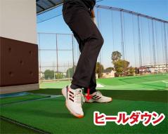 切り返しでは左カカトをヒールダウンするだけでOK。左カカトを踏み込めば腰が回りやすいし、右足のほうはカカトからツマ先に重心が自然に移動して腰の回転に拍車をかけてくれます。