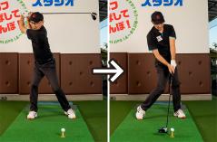 縦の体重移動は「足踏み」の感覚です。左足をヒールアップするのがいいと頭では理解しても、いきなりやるのは難しいかもしれません。最初のうちは左カカトを大きく浮かせなくても、足踏みの要領で前後の重心移動を感じてください。バックスイングで左カカトがあまり浮かなくても、重心がツマ先側に乗ってくることでヒールアップしているような感覚となります。