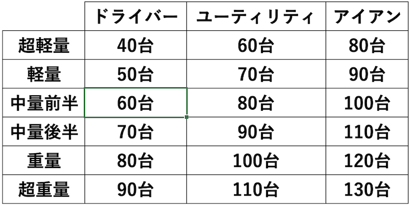 参考までに重量帯別にUTシャフトの適正重量を紹介しておきます。