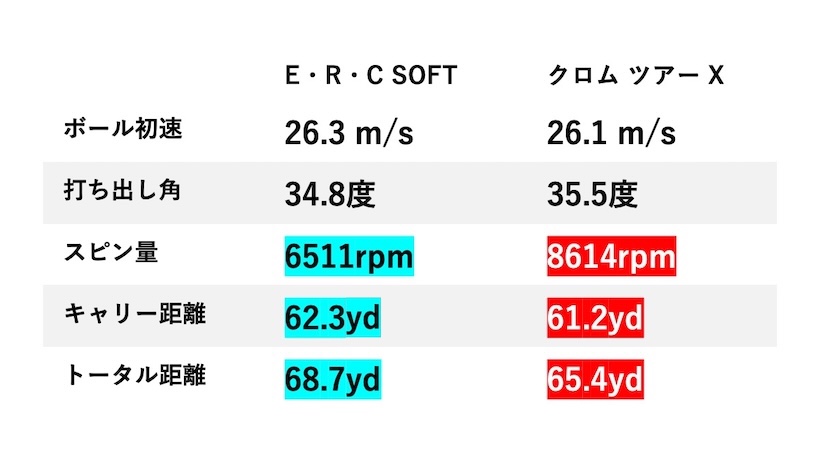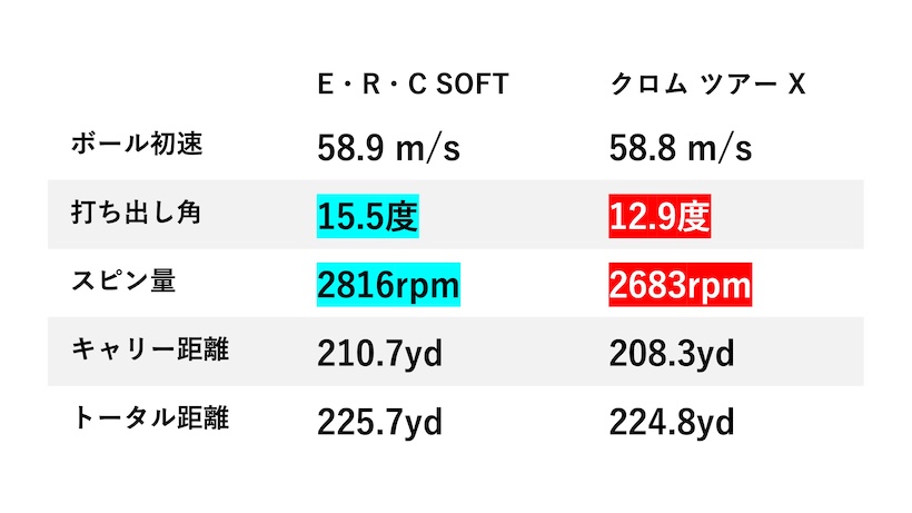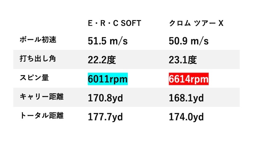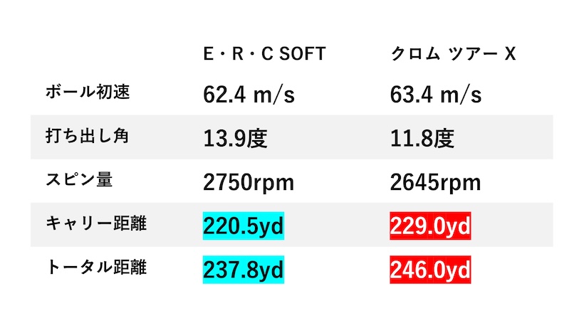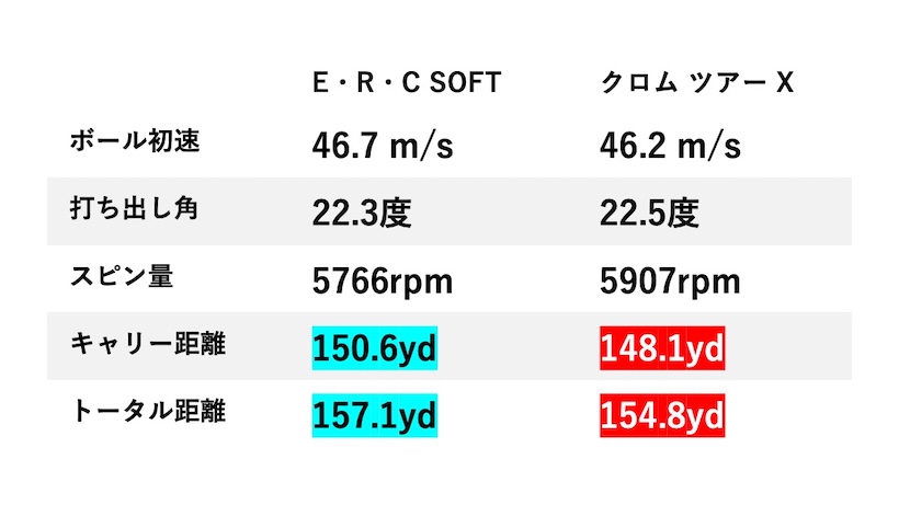ヘッドスピード40m/s、43m/sともにボール初速と打ち出し角は似たような数値だったが、40m/sでは「クロム ツアー X」の方がスピン量が増えた。そのせいかキャリーとトータル距離は「E・R・C SOFT」がわずかながら優る結果となった。一方、43m/sになるとスピン量の差が顕著になった。さらに、ヘッドスピードが3m/sアップしたことで、トータル距離は約20ヤードも伸びて「E・R・C SOFT」、「クロム ツアー X」とも170ヤードを超える結果となった。