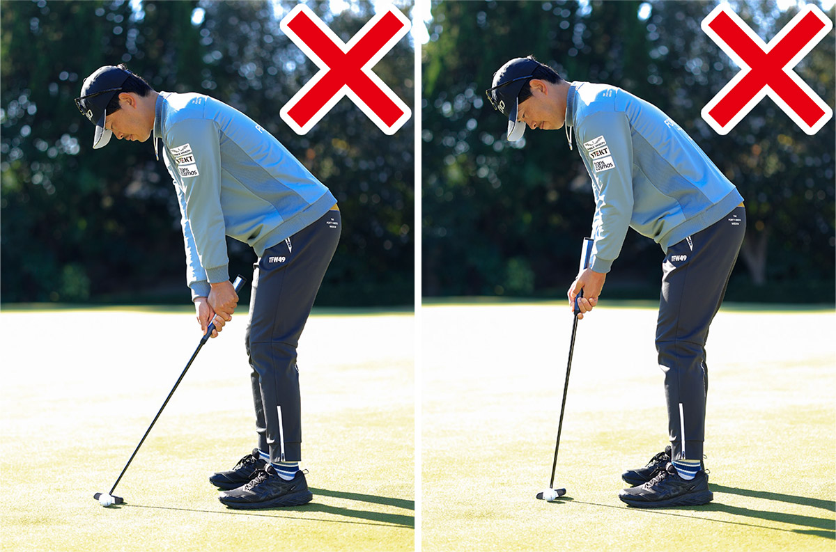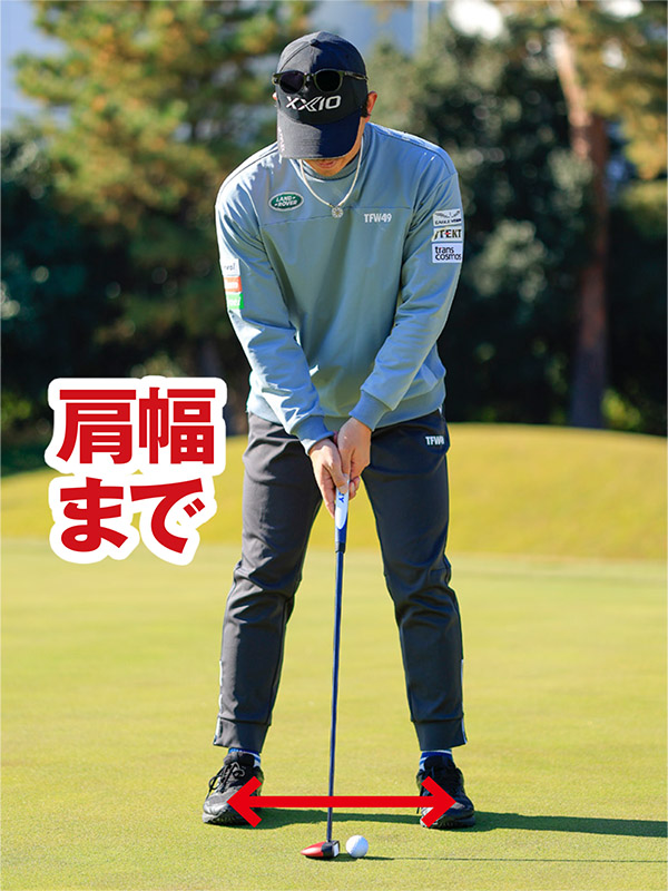 パットのアドレスですが、スタンス幅はそれぞれでいいと思います。一般的には背が高い人は両足を開いてワイドスタンス気味に構えますし、青木瀬令奈プロのように小柄な人は両足をあまり開かないで狭めのスタンスで構えます。