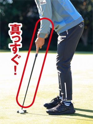 パターを上から吊り下げるような感覚のアドレスというわけで、ポイントは前腕部とパターが真っすぐに見える構えを作ることです。アドレスの姿勢をライン前方から見れば左ヒジから先が一直線に、ライン後方からなら右ヒジから先が一直線となるように構えましょう。これは青木プロたちパットの名手に共通していることです。