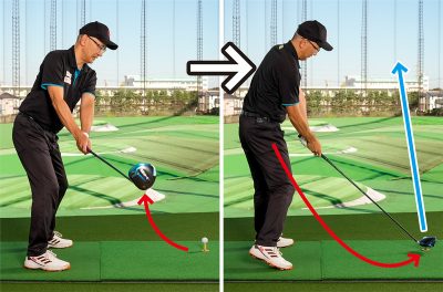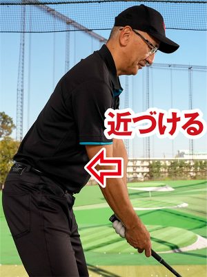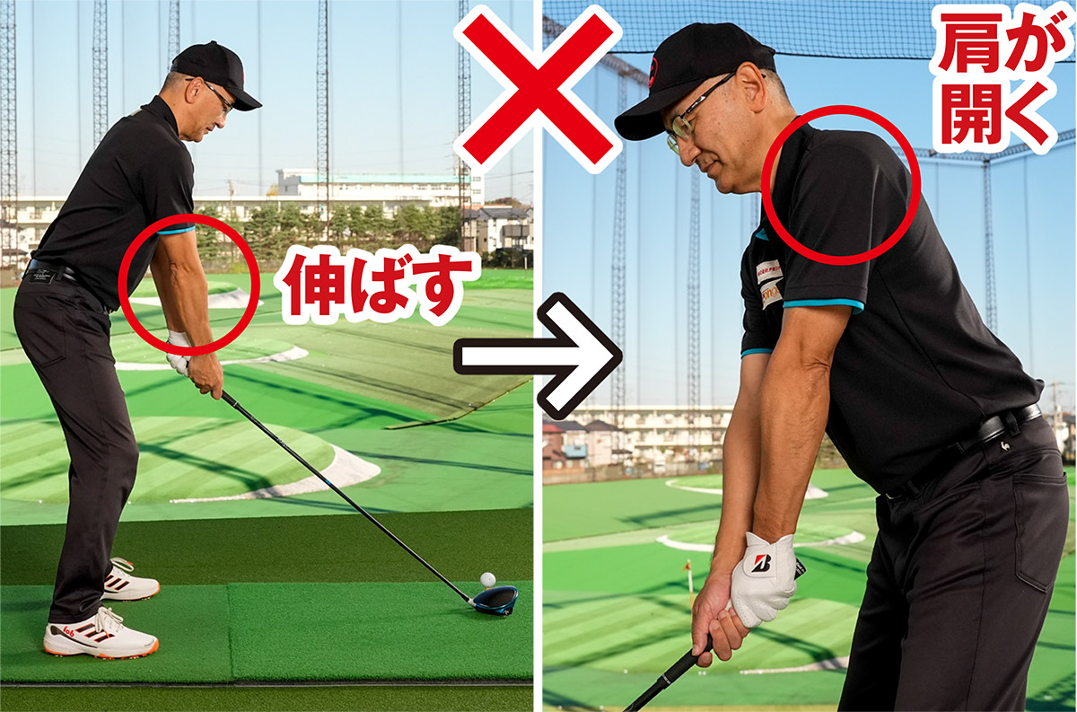 厳密にいえば両ヒジのラインはややクローズとなりますが、結果的にバックスイングでクラブがインサイドに上がりやすく深い捻転が作れますし、ダウンスイングもインサイドから適正角度で下りてきてミート率アップに直結します。