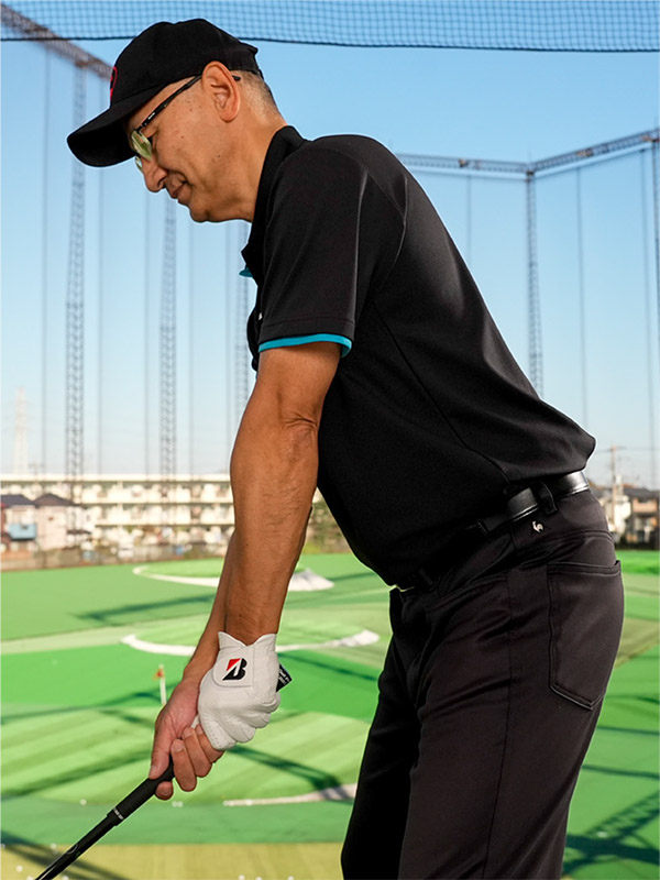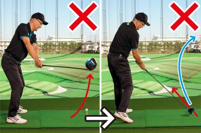 アドレスでは肩や腕の余分な力を抜き、上体をリラックスさせておくのが原則です。「飛ばしてやろう!」と思うと知らず知らずのうちに右手に力が入りやすい。上体が硬直してバックスイングが手上げになり、力みや打ち急ぎを誘発するので「上体はラク~に」を心がけましょう。