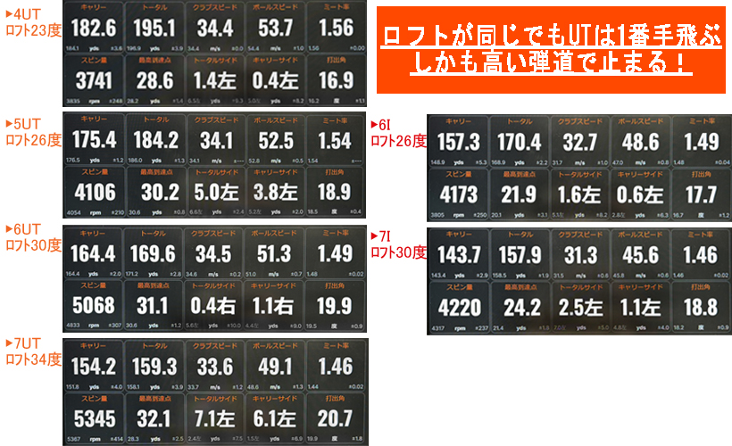 ロフト30度の7番アイアンと同じ距離で出ているのはロフト34度の7UT。ロフト26度の6番アイアンと同じ飛距離が出るのは30度の6UT。しかも、どちらもUTの方が最高到達点が高く、トータル飛距離とキャリーの差(ラン)が小さくなっています。つまり、キャリーが出て“止まる”球になっていることがわかるはずです。