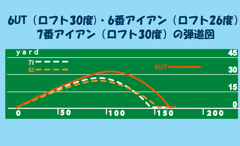 弾道図で一目瞭然ですね。アイアンを7番までにして、6番アイアンの代わりのUTを選ぶのなら7番アイアンと同じロフトのUTを選べばOKということです。6番アイアンまでセッティングして、5番アイアン代わりのUTが欲しいなら6番アイアンと同じロフトのUTを選べばいいということです。