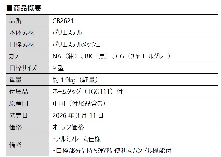 リヂストンから1.9kgのブリヂストン最軽量モデル「軽量アルミフレームモデル」新発売 2026/03/15 ゴルフサプリ編集部 ブリヂストンスポーツ株式会社は、軽さと使いやすさにこだわった『軽量アルミフレームモデル(CB2621)』を3月11日より発売する。価格は全てオープン。 画像をまとめて見る 重量が1.9kgで、筒無しの構造ながらアルミフレーム採用により持ち手の安定感を保持している。また、杢調の生地を採用し、落ち着いた雰囲気に仕上げた。カラーバリエーションは3色。 【お問い合わせ先】お客様コールセンター TEL 0120-116613