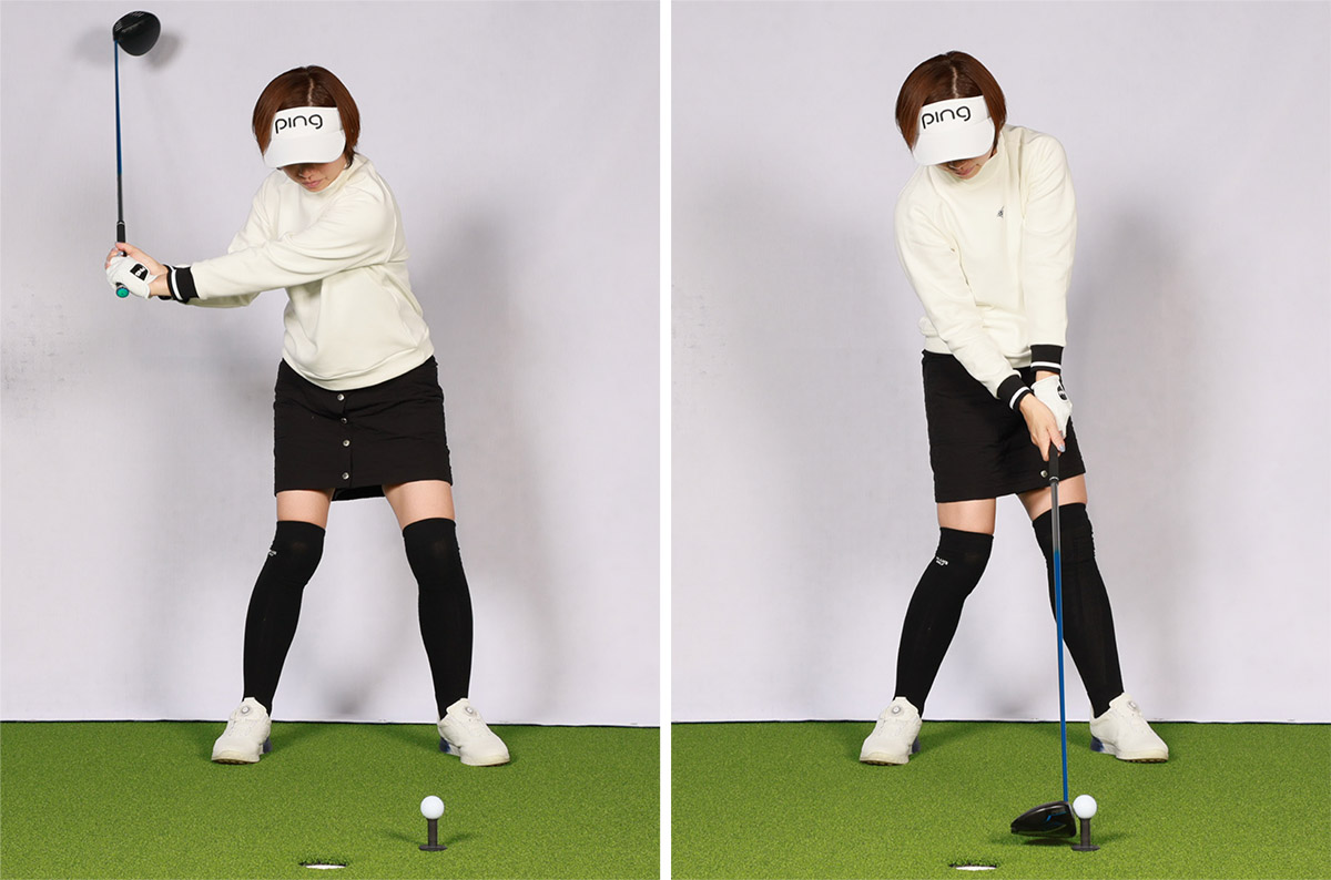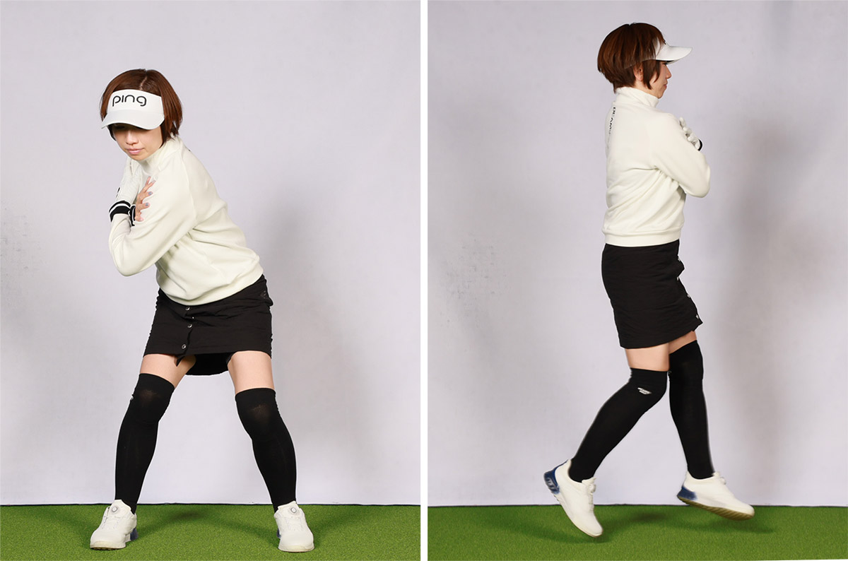 具体的には、左足ツマ先側の母指球で地面を受け止めることで左腰が後ろに下がりクルッと回ります。よく「左足の外側で体重を受け止める」と言われますが、それは腰が回ってからのことで、回転を促すにはツマ先側で踏むことが不可欠なのです。