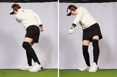 この感覚はクラブを持たずにスイング、バックスイングで腰を落として体を沈め、ダウンスイングからインパクトのイメージでジャンプしながら左回転してみるとわかります。ジャンプしながら左に回転するには、一瞬でも左ツマ先で地面を踏まなければならず、左足の外側やカカトで地面を踏んでもできません。とはいえ意識しながら左ツマ先を踏むのは難しいので、このイメージでスイングしてみることをおすすめします。
