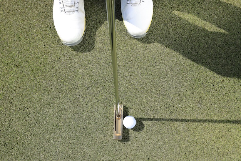 このパターは、使用するボールによっても印象が変わるのだろうか? そこで、硬めと軟らかめ、2つのボールを用意して試してもらったのだが、飛距離特化型の硬めのボールではややシャープな音に、軟らかいボールではより心地よいフィーリングが得られるという。