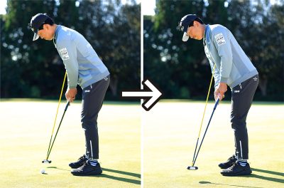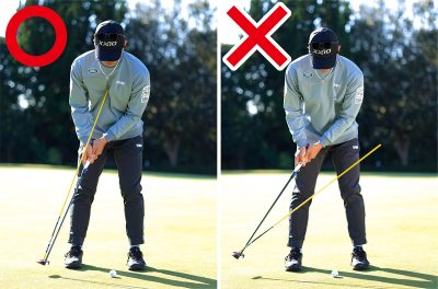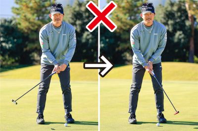 パットは手や腕を使わずに、お腹の小さい回転と両肩の上下動をリンクさせてストロークするのが大原則です。ショットと比べるとかなり小さい動きとはいえ、カラダの回転が主体となるのは一緒です。それについては前回お話しましたが、今回はさらに詳しく解説していきたいと思います。