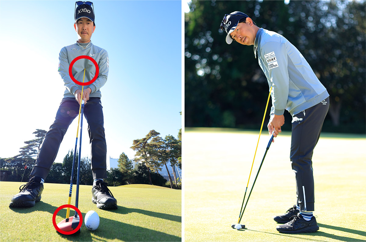 ゴルファーの身長によっては普段のアドレスよりもボールから離れて立たないとアライメントスティックの長さが合わないというケースもあるかと思いますが、みぞおちとパターヘッドを連結させるイメージを把握するのが目的ですからそれでもOKです。