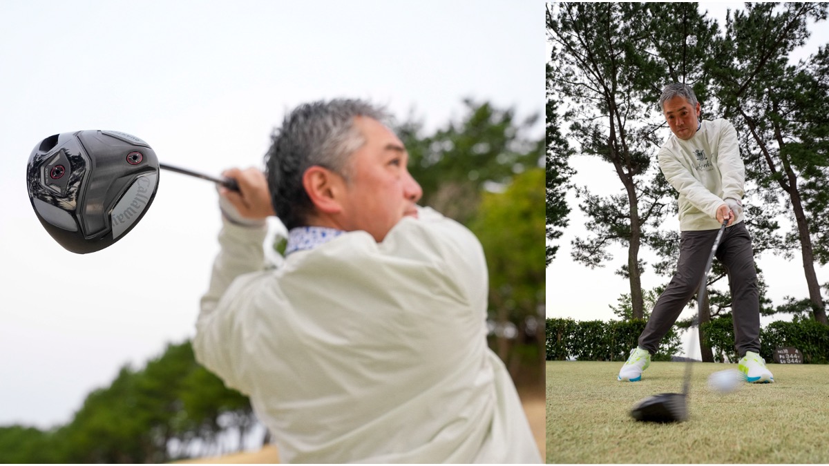 「ミニサイズと言いますが、僕はキャロウェイの歴代ミニドライバーを構えた時にヘッドが小さいと感じたことがありません。『QUANTUM MINIドライバー』もそうで、ヘッドの投影面積が大きくて、見た目は歴代モデルとほとんど一緒。でも違いはちゃんとあります。まずはインパクト感で、ボールがフェースに軟らかく吸いつくのが『Aiスモーク』。強く弾いて飛ばす感じなのが『ELYTE』。それらに比べて『QUANTUM MINIドライバー』はボールがフェースに乗っている時間が増えて球持ちがよくなり、コントロール性がアップしています。いわば初代と二代目のいいところ取り。ヘッドが小さいぶん音が散らないせいか、ちょっとこもった打音で、それも打感を柔らかく感じさせる一因かもしれません」