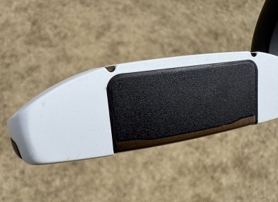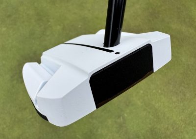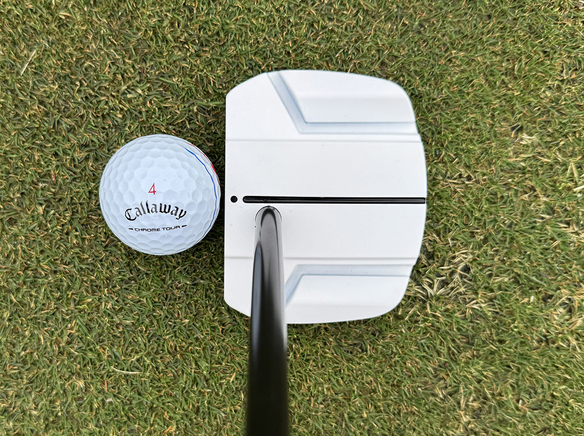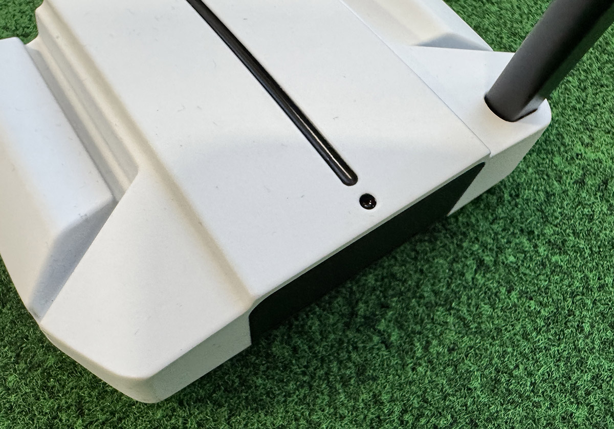 構えてみると、とにかく白いヘッドがグリーンに映えて、ヘッドの形状がくっきりと見えます。四角めの形は目標方向に対してとても構えやすい。またシャフトがフェース面よりも後ろに挿さっているので、フェース面のラインが全部見えるというところもアライメントが取りやすいですね。