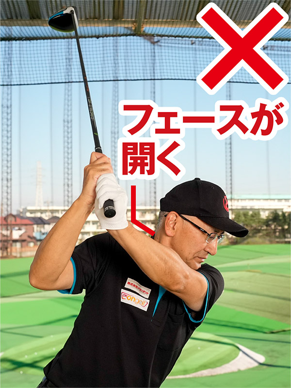 縦コックでクラブを上げていくと、トップで左手首が甲側に折れやすい。これはフェースが開いた状態で、そのままでダウンスイングするとオープンフェースで打ってしまうことになるのです。