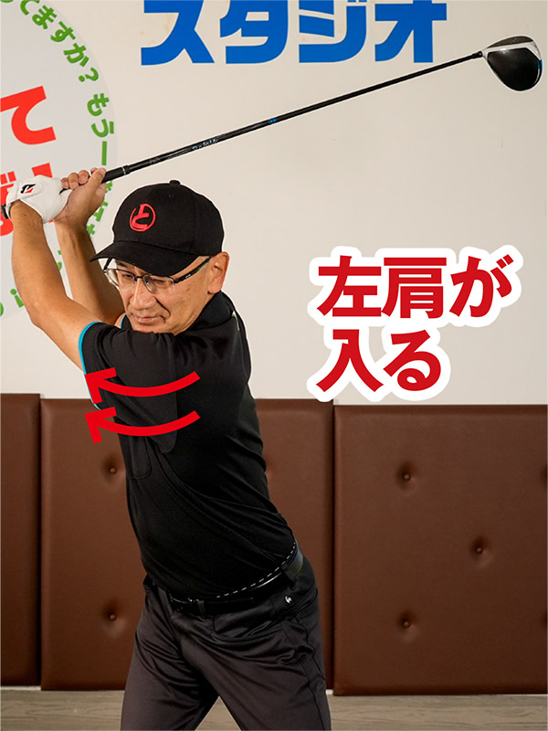 そしてインパクト後はクラブを左肩の上に上げて胸が目標を指すまで肩を回せば、フィニッシュのカタチが作られます。