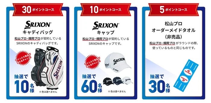 さらに、30ポイントコースと10ポイントコースでは、松山プロ、畑岡プロのサイン入りが当たるかも。サイン入りかどうかは届いてからのお楽しみ。