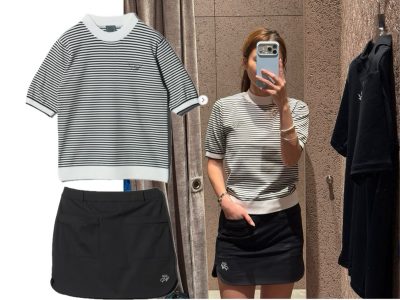 ボーダートップスにブラックスカートを合わせた、シンプルで大人っぽいコーデ。カジュアルになりがちなボーダーも、モノトーンでまとめることで上品な印象に。ゴルフ後そのまま帰宅してもかわいい万能スタイル。