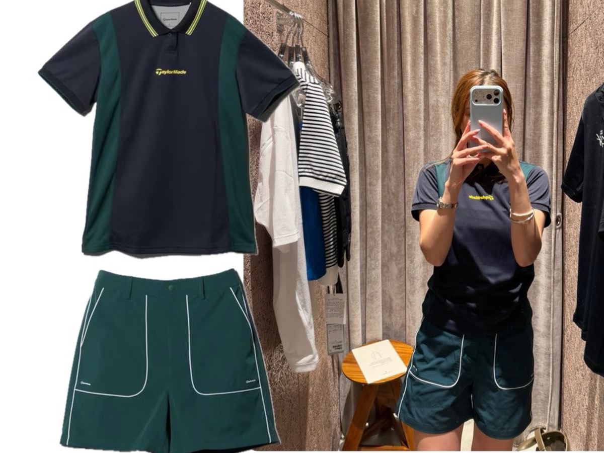 テーラーメイドとのコラボアイテムでまとめたクールなコーディネート。ブラックのトップスにグリーンのパンツを合わせた、まさに“THEゴルファー”なカラーリングが魅力。シンプルながらもコースで映える、王道スタイルでウェアからゴルフ気分を上げていく。