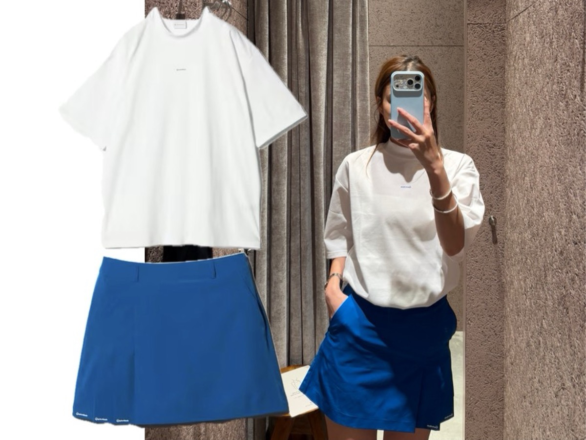 日体大ゴルフ部の意見を取り入れて作られたというこちらのウェア。白のモックネックに“日体ブルー”のスカートを合わせた、爽やかで目を引くコーデ。見た目の可愛さはもちろん、機能性も抜群。