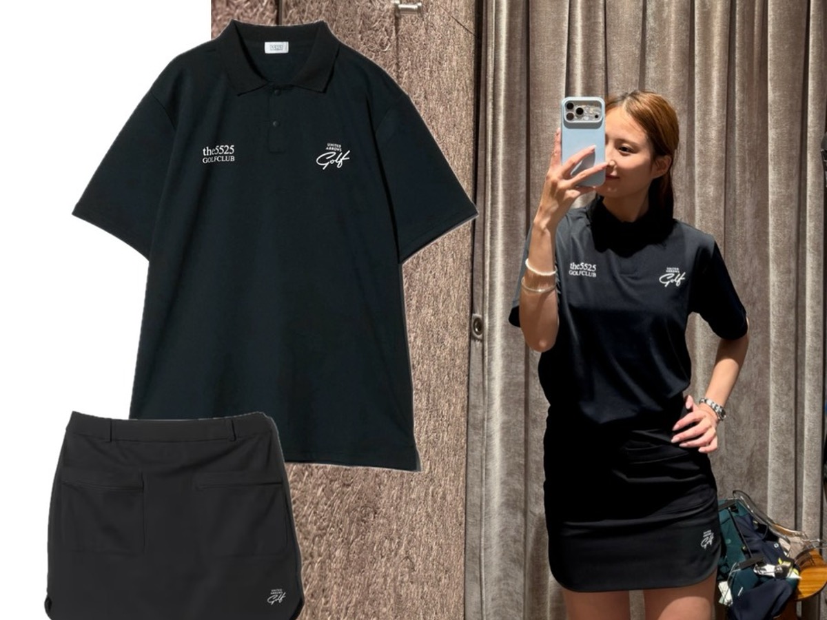 5525golfとのコラボポロシャツに、ユナイテッドアローズ ゴルフのブラックスカートを合わせたブラックコーデ。オールブラックでまとめることで、シンプルながらもぐっと洗練された印象をプラス。特にお気に入りのスタイル。