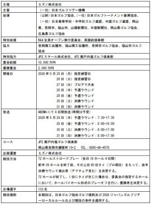 また、2026年3月に発売された「JPX ONE」ドライバーなど、ミズノ製品を試打できるブースや、野球グラブの製作過程で出る端材・廃材を活用したモノづくりワークショップの開催など、ミズノならではの魅力あるゴルフトーナメントを目指す。
