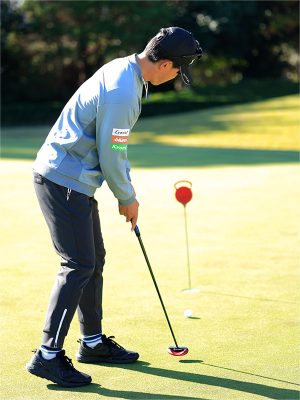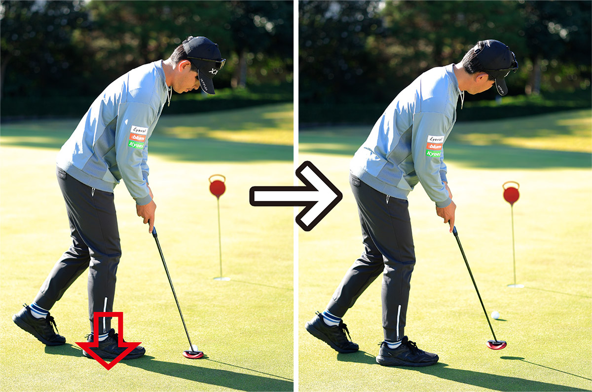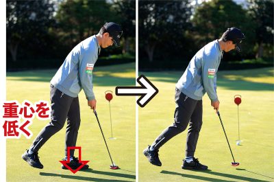 いずれにしても両方をしておくことで、足のトレーニングにもなります。アドレスの段階から重心を低い位置にキープして、ストローク中に下半身が絶対にブレないように両足を踏ん張る習慣づけができるのです。結果としてインパクトで上体が起きたりカップ側に流れたりすることがなくなり、カップインの確率が大幅にアップします。