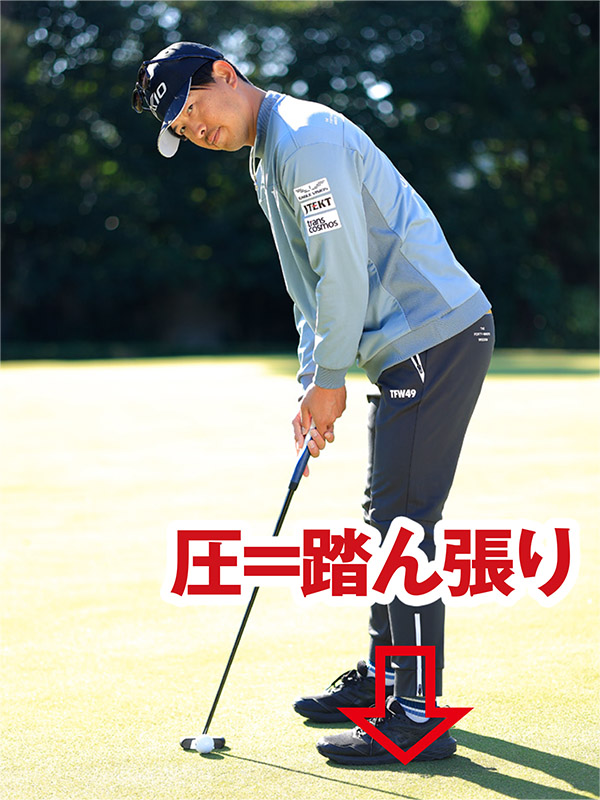 青木瀬令奈プロのようにパットのうまい人は、アドレスは何となくすっと立つ感じで構えているように見えるかもしれませんが、実は自分の体重を両足にグイッと乗せる感じで構えているのです。だから青木プロたちは片足立ちのストローク練習でも、下半身がビクともしません。
