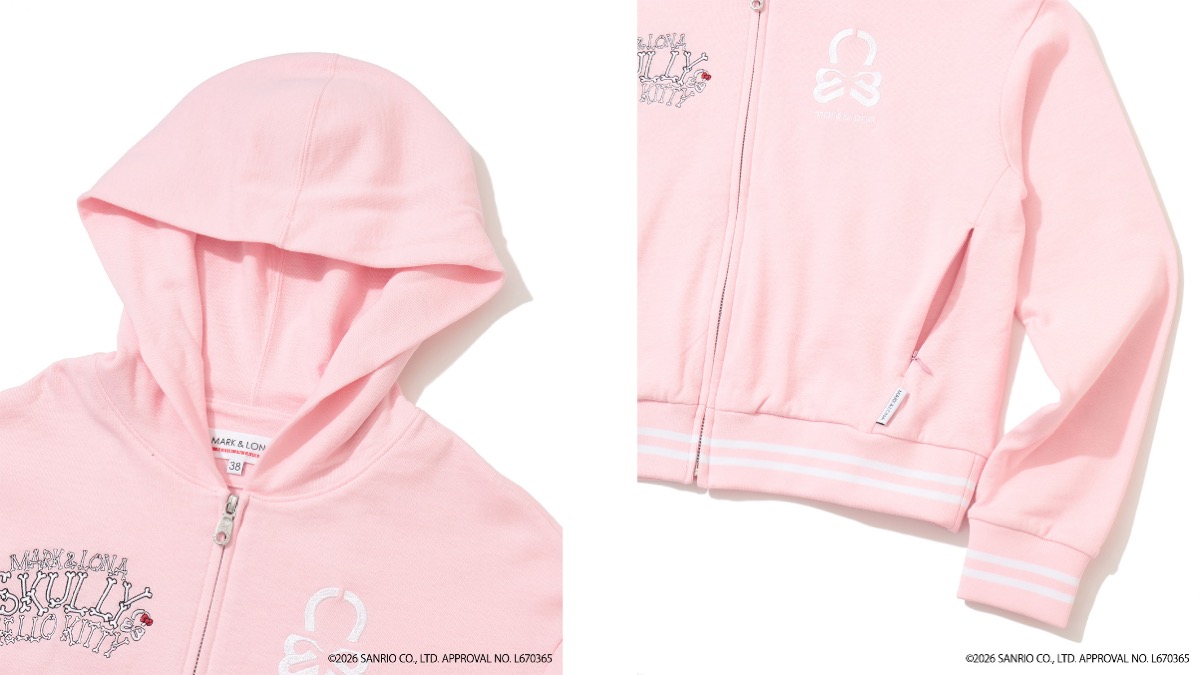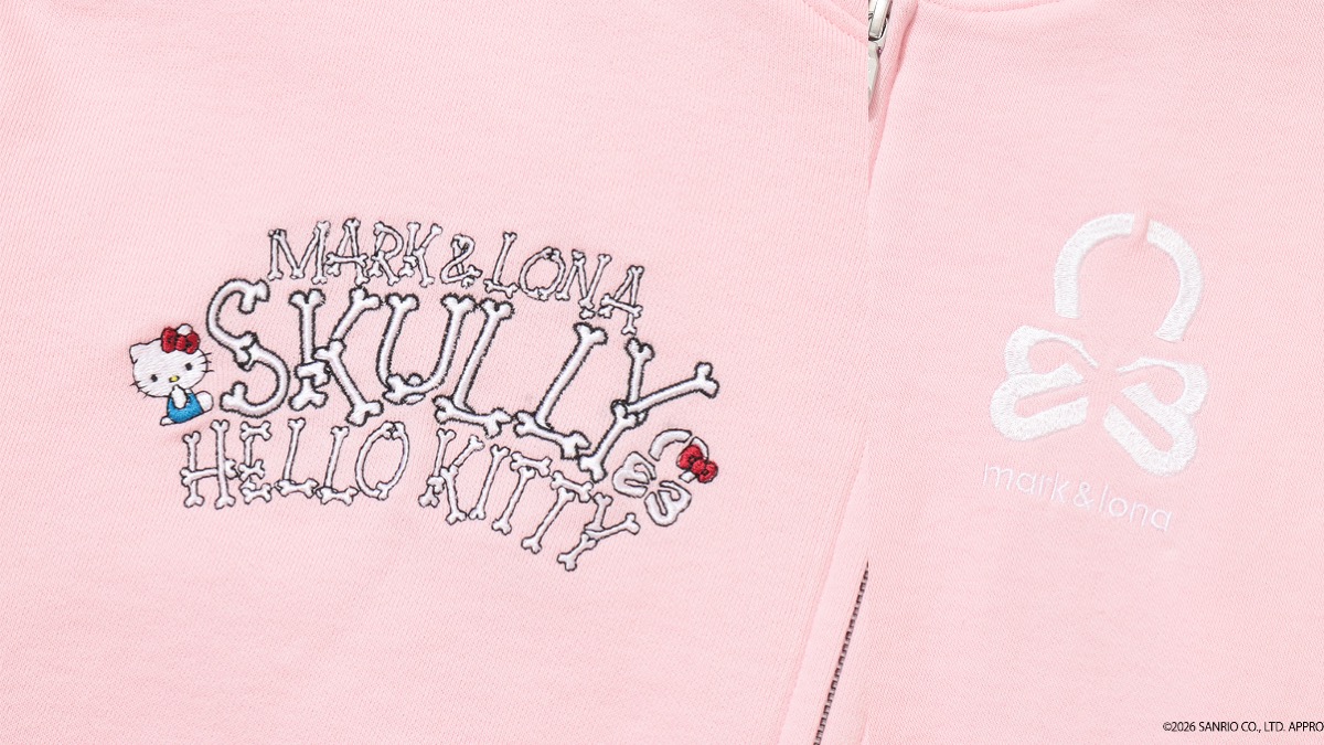 ハローキティとのスペシャルコラボレーションロゴ「Skully×Hello Kitty」をあしらったデザインのパーカー。胸元には今シーズンを象徴するアイコン「エレメントスカル」も施し、遊び心あふれる表情に仕上げた。発泡プリントの立体感と繊細な刺繍を組み合わせることで、ポップさの中にもMARK & LONAらしいアイコニックな存在感を演出。